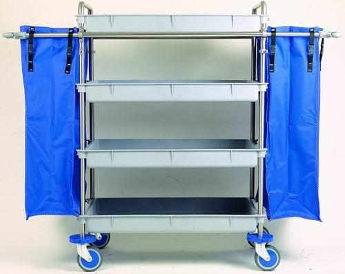 Carro para lencería con 4 bandejas de plástico polipropileno, color gris, cromado, 2 bolsas plastificadas, asas telescópicas, ruedas de 125 Ø.