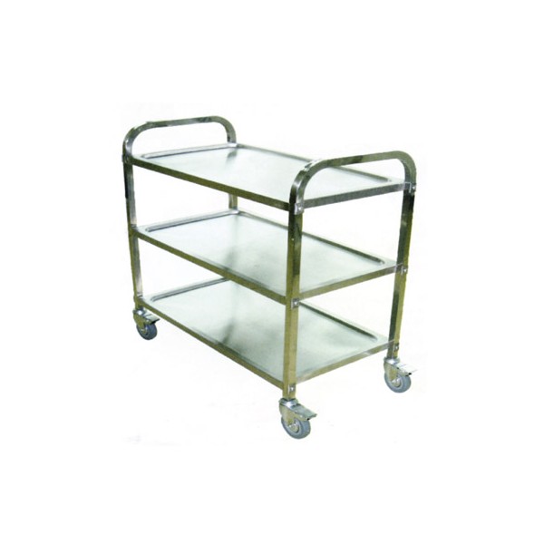 Carro camarera de acero inoxidable perfecto para restaurantes, catering, medio hospitalario, hoteles, etc. Carro inoxidable con 3 bandejas y 4 ruedas giratorias. Separación entre bandejas de 30 cm. Tamaño de las bandejas 90 x 50 cm.