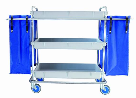 Carro cromado, 3 bandejas de plástico, polipropileno, 2 bolsas plastificadas, asas telescópicas, ruedas 125 Ø. Se fabrica en acero inoxidable 18/8. Color gris. Capacidad bolsa: 77L