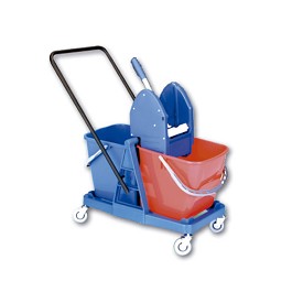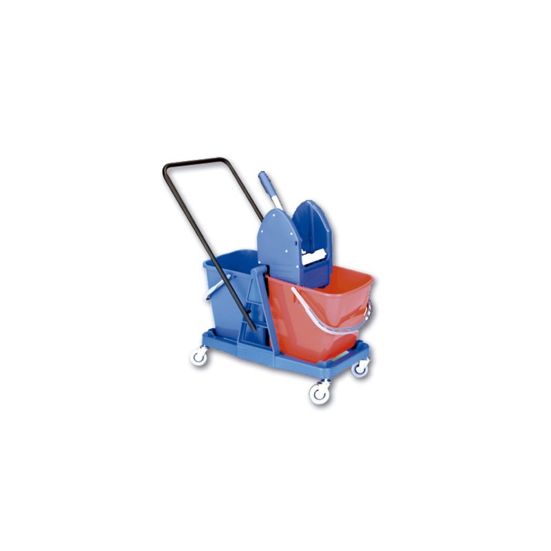 Carro doble con dos cubos de 25 litros. Estructura base con ruedas y manillar oscilante. Con prensa modelo STILO perfecto para limpieza en hoteles, oficinas, centros comerciales, etc. Por su plástico de gran calidad y su diseño resulta altamente resistente. Gracias al manillar oscilante se facilita el cambio de sentido del carro. Fácil traslado gracias a sus ruedas giratorias (360º).