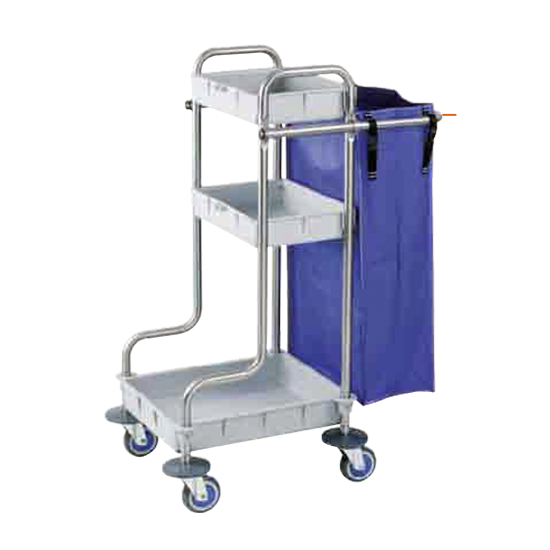 Carro Fregado-Fácil con 3 bandejas de polipropileno, asa telescópica, 1 bolsa plastificada, ruedas de 100 Ø con para-golpes. Se fabrica en acero inoxidable 18/8.
