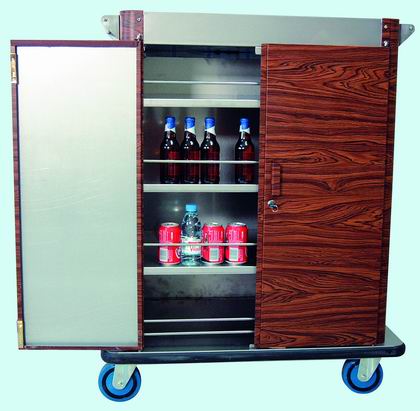 Carro de reposición de bebidas con ruedas giratorias de 160 Ø. Base de acero inoxidable 18/8 con protector de goma. Cuatro estantes de acero inox. 18/8. Las puertas van provistas de cerradura. Cuerpo de chapa galvanizada plastificada decorplate con PVC estampado beige y marrón.