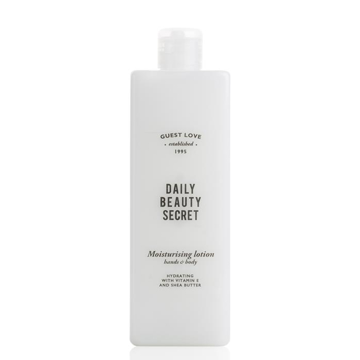 La loción hidratante para manos y cuerpo Guest Love está enriquecida con vitamina E y manteca de karité.