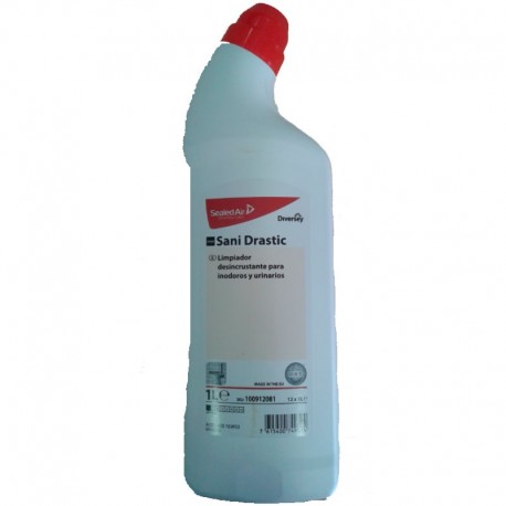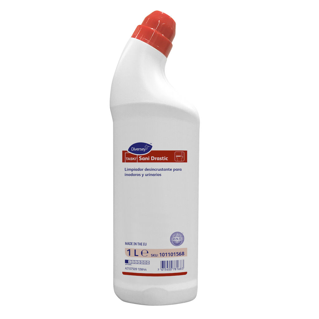 TASKI Sani Drastic es un potente limpiador líquido con poder desincrustante y desodorizante para inodoros y urinarios. TASKI Sani Drastic está pensado para ser utilizado en inodoros. No utilizar sobre superficies metálicas como acero inoxidable, aluminio, cobre, latón, superficies esmaltadas, cromadas o plásticas. La botella con tapón direccional es muy fácil de utilizar, sólo tiene que dirigirla hacia el borde interior por toda la taza, y dejar actuar unos minutos. Las propiedades higienizantes de TASKI Sani Drastic aseguran la completa higiene