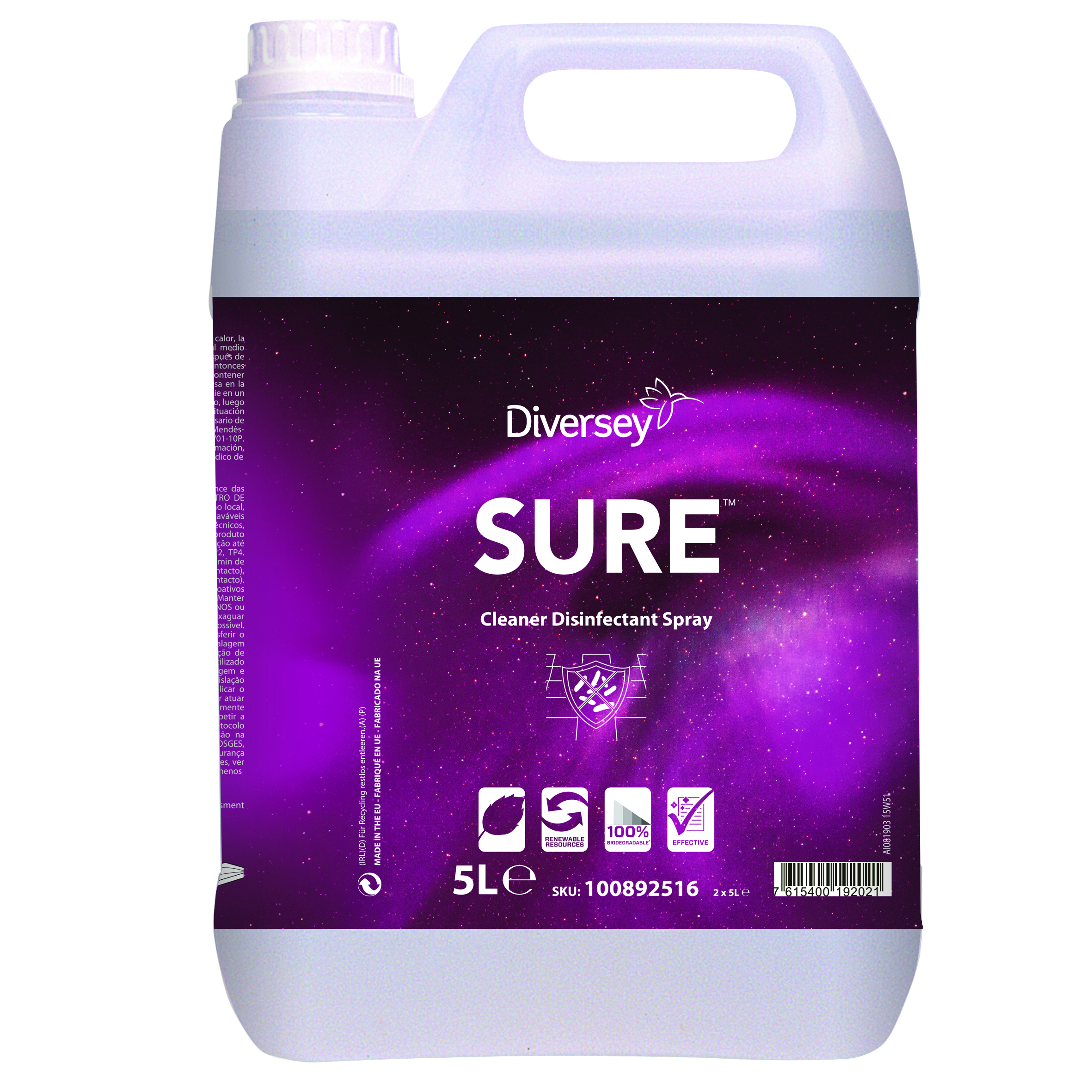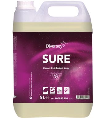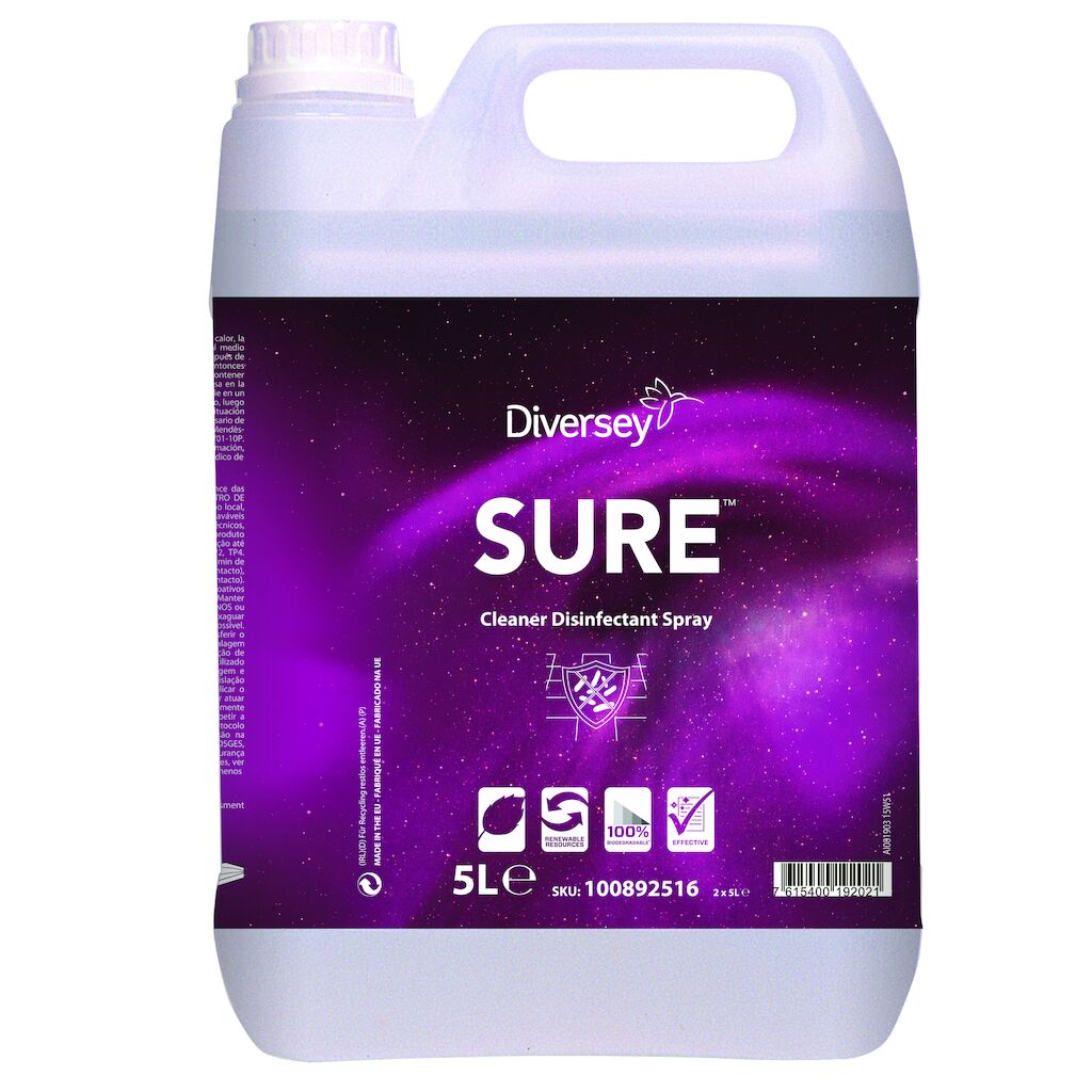 SURE Cleaner Disinfectant Spray es parte de una exclusiva gama de productos de limpieza profesional en base a plantas, 100% biodegradable y para todas las necesidades de una limpieza diaria. SURE Cleaner Disinfectant Spray es un detergente desinfectante listo para usar para la limpieza y desinfección de todas las superficies en contacto con alimentos. Listo para usar. Efectivo en todo tipo de aguas. Sin perfume ni colorantes.