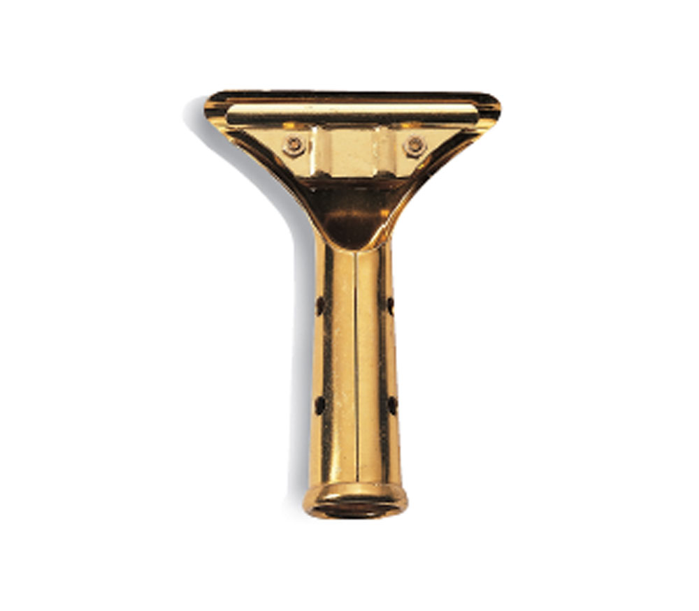 Clásico del profesional cristalero, está construido con las características de precisión que lo hacen único en su género. La guía , perfilada en latón extruido, templado, abrillantado y barnizado antióxido y anticorrosión, garantiza alta precisión en el contacto de la goma sobre el cristal. La empuñadura está construida en latón macizo y anatómico. Para fijar la tensión de la goma en la guía, va provisto de dos clips de sujección, se acopla perfectamente sobre mangos telescópicos para limpieza de cristales en altura. La característica determinante para la calidad del limpiacristales es el corte a vivo del labio de goma. Esto evita estrías y rayas sobre el cristal. Otros requisitos fundamentales de la goma son su mezcla y su resiliencia. También disponible empuñadura, clip de sujeción, guía y goma por separado.