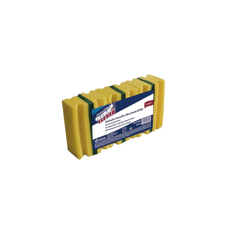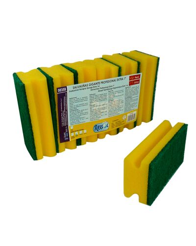 Esponja salvauñas con fibra verde extra de 1ª calidad. Especial para limpieza de cocinas, quemadores, suelos y en general para limpiezas difíciles. La fibra limpia las superficies y la esponja limpia y seca. Máxima abrasión. Ergonómico, adaptable a la mano. Resistente, duradero y con gran poder de abrasión. No contiene ingredientes peligrosos. Se recomienda enjuagar y limpiar después de cada uso.