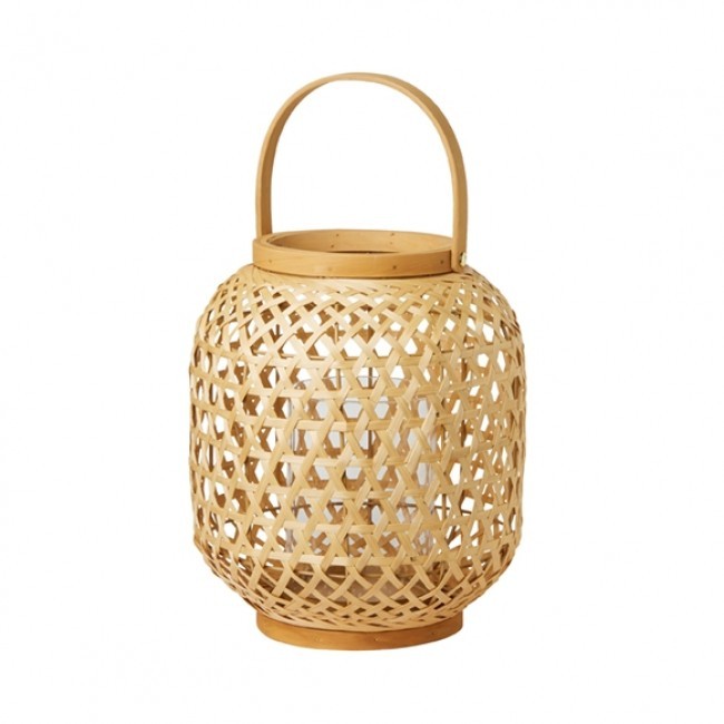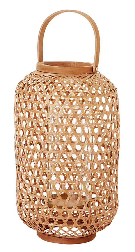 Vela linterna fabricada en bambú ecológico. Hecho a mano, se puede usar en interiores y exteriores. Viene con inserto de vidrio y soporte de metal.