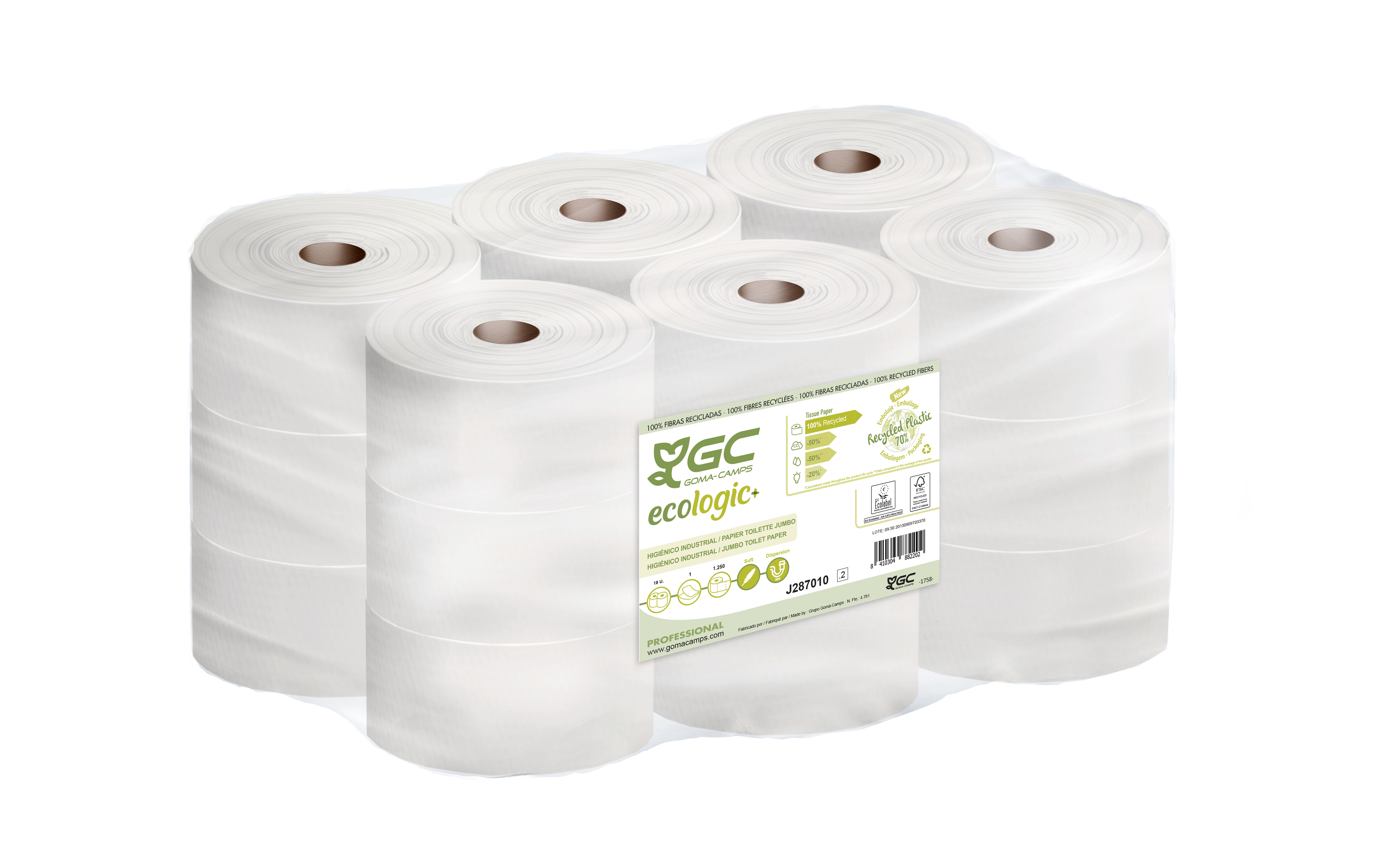 Rollo higiénico industrial de celulosa reciclada, ecológica y certificada, para uso intensivo en lugares de tránsito medio como restaurantes, hoteles. Los metrajes varían desde los 100 metros a los 350 metros.