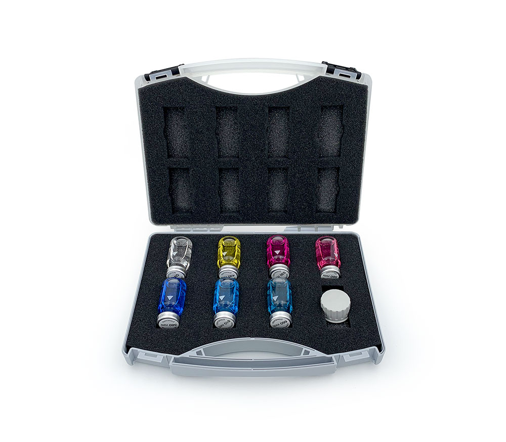 Los estándares de verificación se utilizan para comprobar la precisión fotométrica y la reproducibilidad de los resultados en las diferentes longitudes de onda. El kit contiene una cubeta cero y seis cubetas de medición diferentes para comprobar seis longitudes de onda distintas. De este modo, se pueden excluir posibles errores de medición, por ejemplo, debidos a filtros de interferencia defectuosos.
