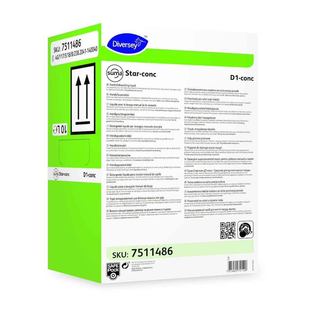 Suma Star Conc es un detergente líquido altamente concentrado para el lavado de ollas, cacerolas , vajilla, vasos y todo tipo de utensilios lavables. Elimina la grasa y manchas resecas de comida. Aclarado fácil y sin velos para un acabado superior. Su espuma estable es un indicador de una eficacia más duradera. El uso del Sistema Refill o DQFM de Diversey ayuda a reducir los residuos y ahorrar en costes
