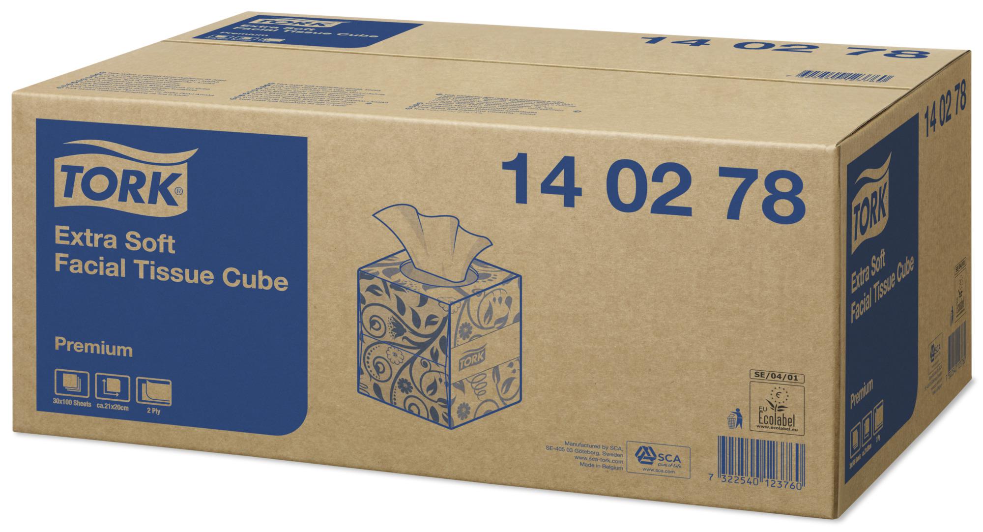Los pañuelos faciales extrasuaves de Tork vienen en una caja en forma de cubo de moderno diseño que puede colocarse donde lo necesite para demostrar a sus clientes un cuidado superior gracias a su sensación y rendimiento de primera calidad. Toallita extrasuave que cuida la piel Resistente y absorbente para una comodidad extraGran brillo para dar sensación de higiene