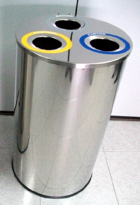Papelera para reciclaje redonda fabricada en acero inoxidable 304 de 1 mm, con departamentos individuales y tapa abatible.