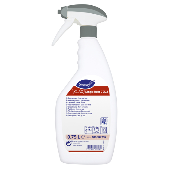 Clax Magic Rust es un quitamanchas con excelentes propiedades para eliminar manchas de hierro y óxido de hierro. El producto está especialmente formulado para uso en lavanderías y listo para usar en la mayoría de tipos de tejidos.